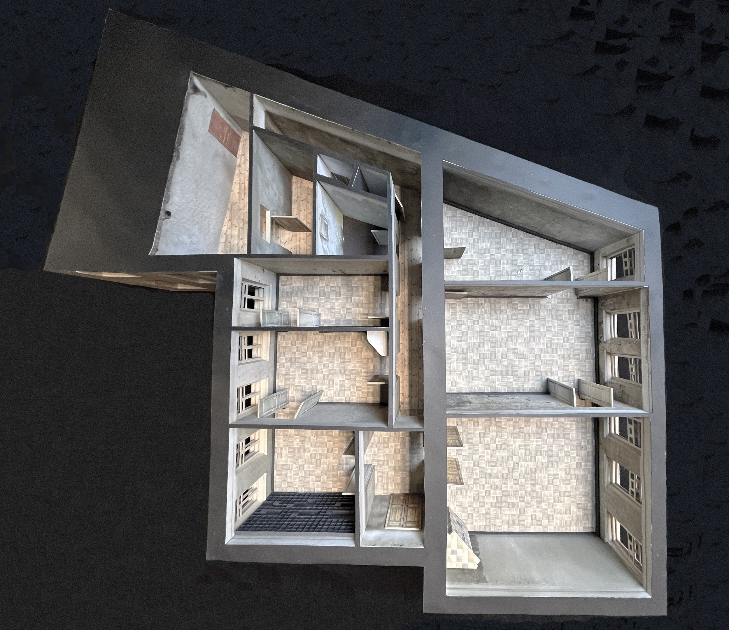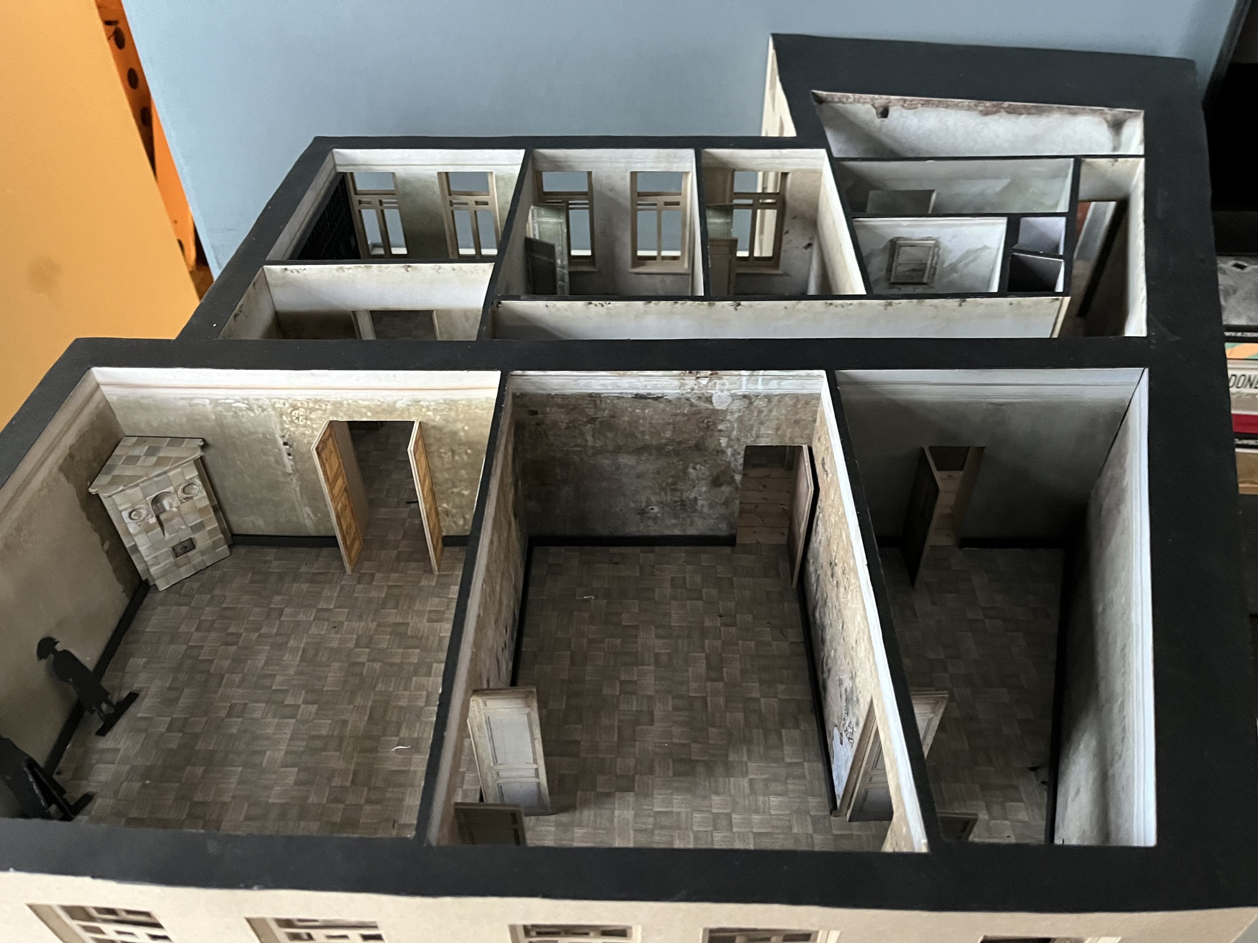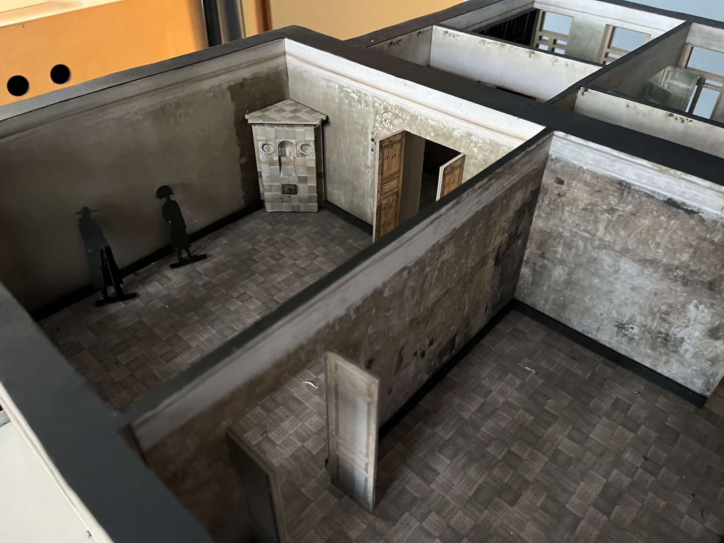 Далее на сцену вышел архитектор, которому предстояло адаптировать комнаты к музейному показу.Сергей Мишин начал с того, что построил макет – точную копию квартиры, в которой сохранена не только планировка, но и кривизна стен, рисунок лепнины, фактура стен. С помощью камеры эндоскопа (!) можно было «гулять» по квартире и настраивать освещение, примерять витрины, населять ее героями.