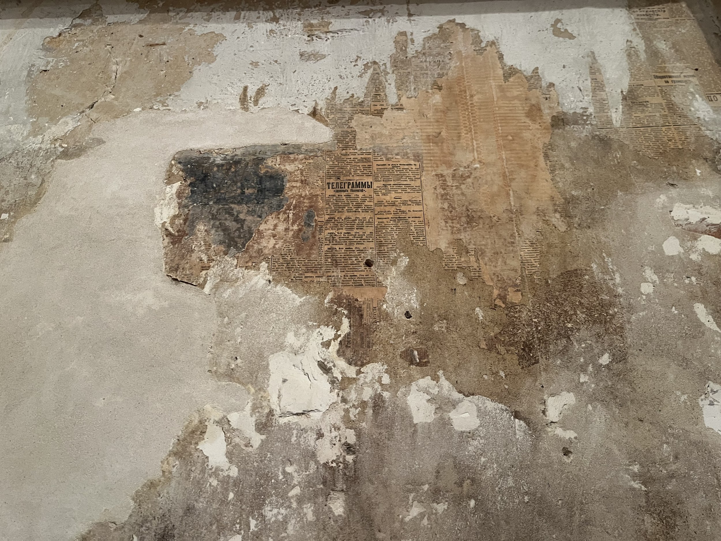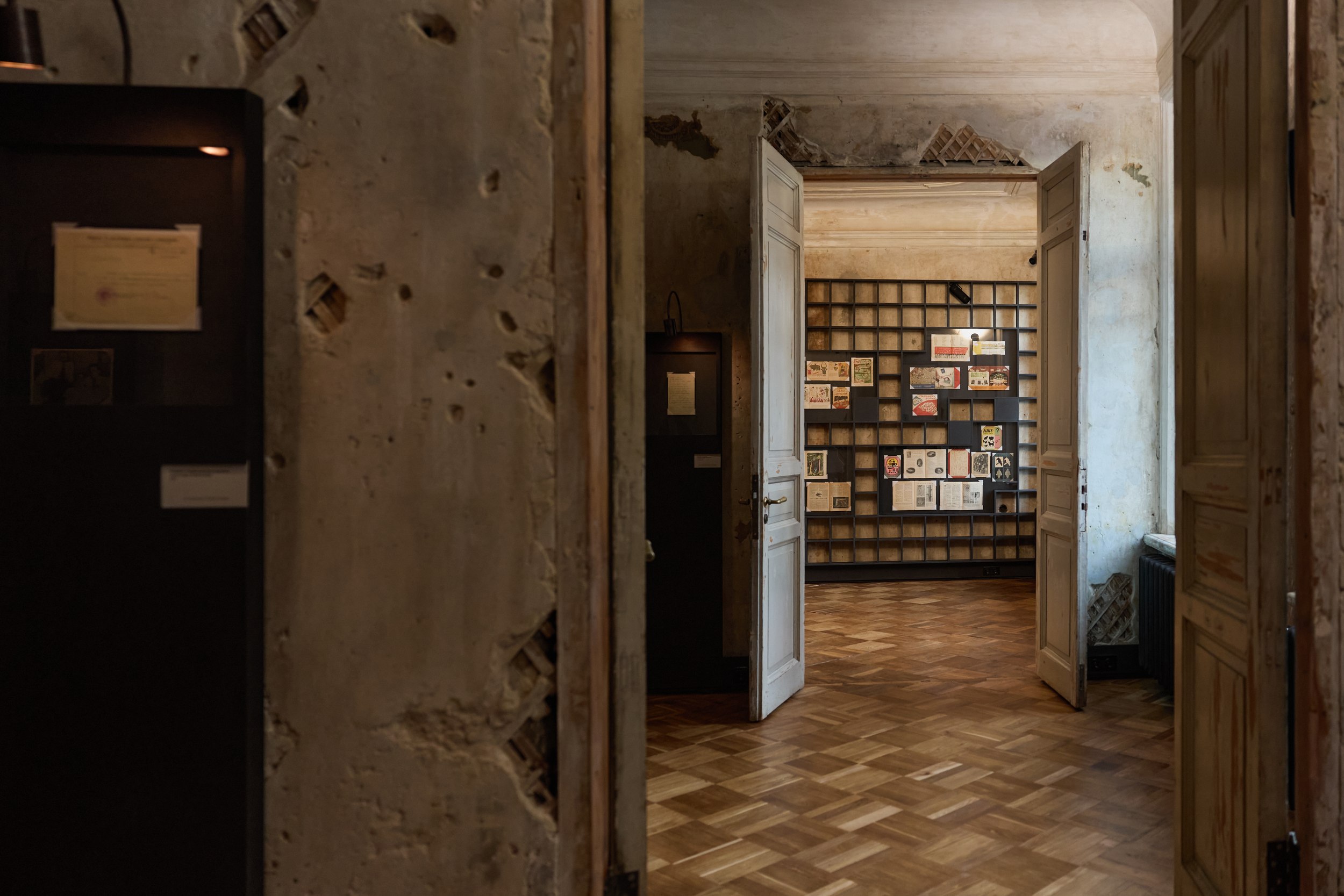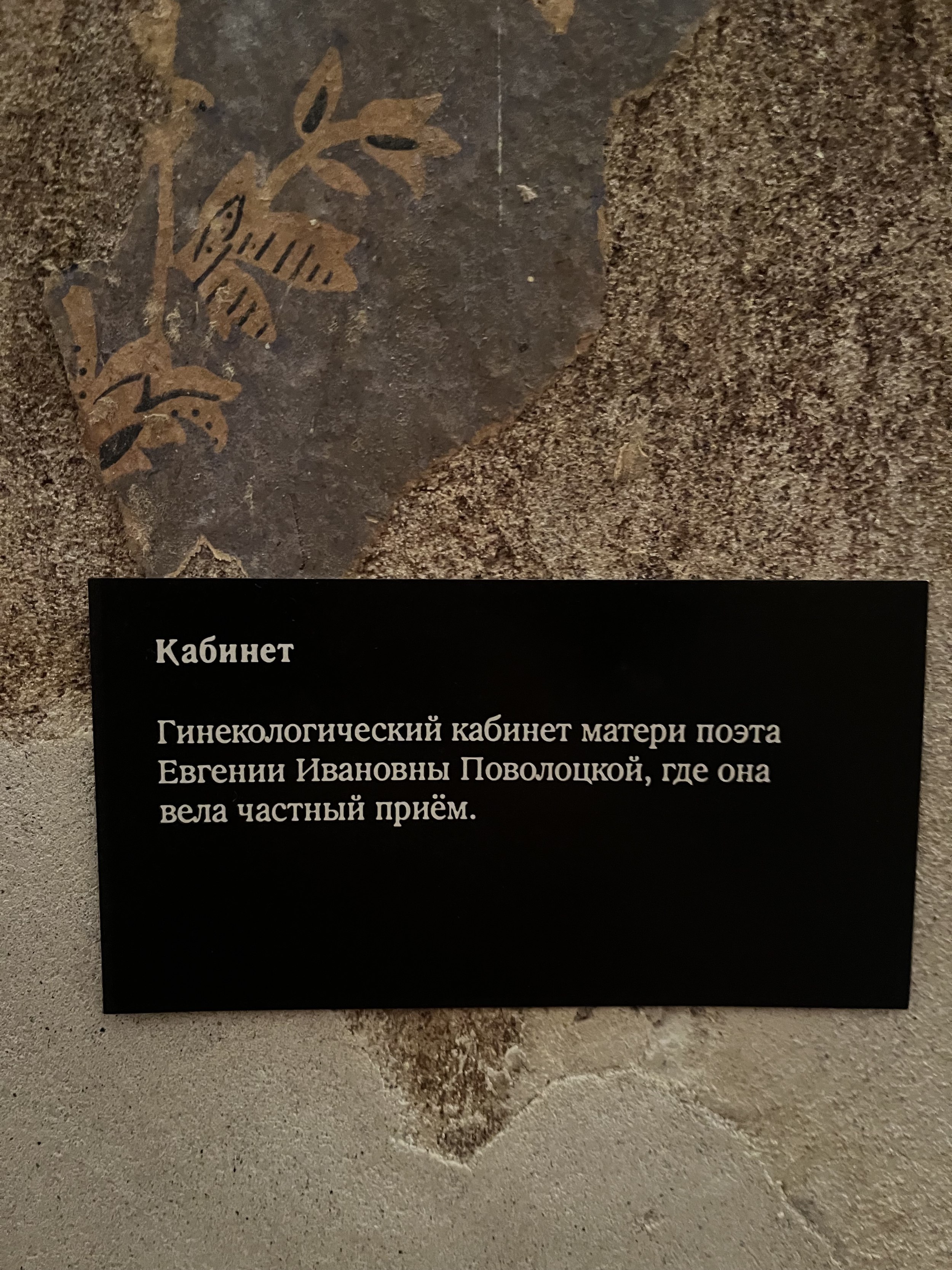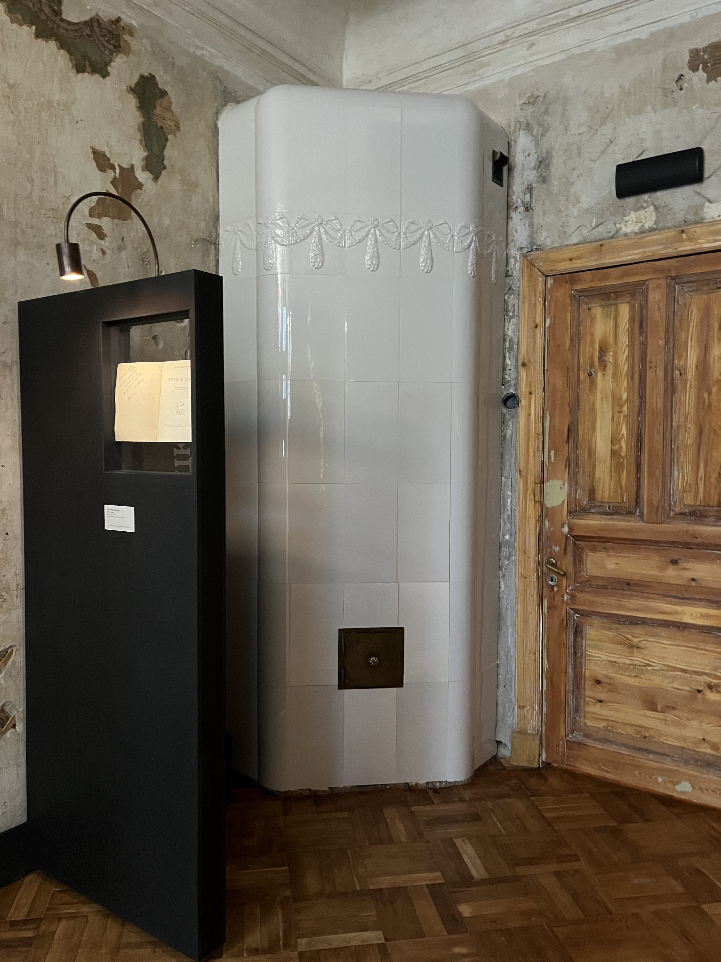 Стены с островами сохраненных фрагментов можно разглядывать бесконечно, всматриваясь в каждое пятно: почему тут написано Prague, что за дверца, какой предмет оставил этот контур? На торце двери – кажется невероятным – сохранилась отсечка, которой отмечают рост: когда семья переехала в квартиру, будущему поэту было всего 10 лет.