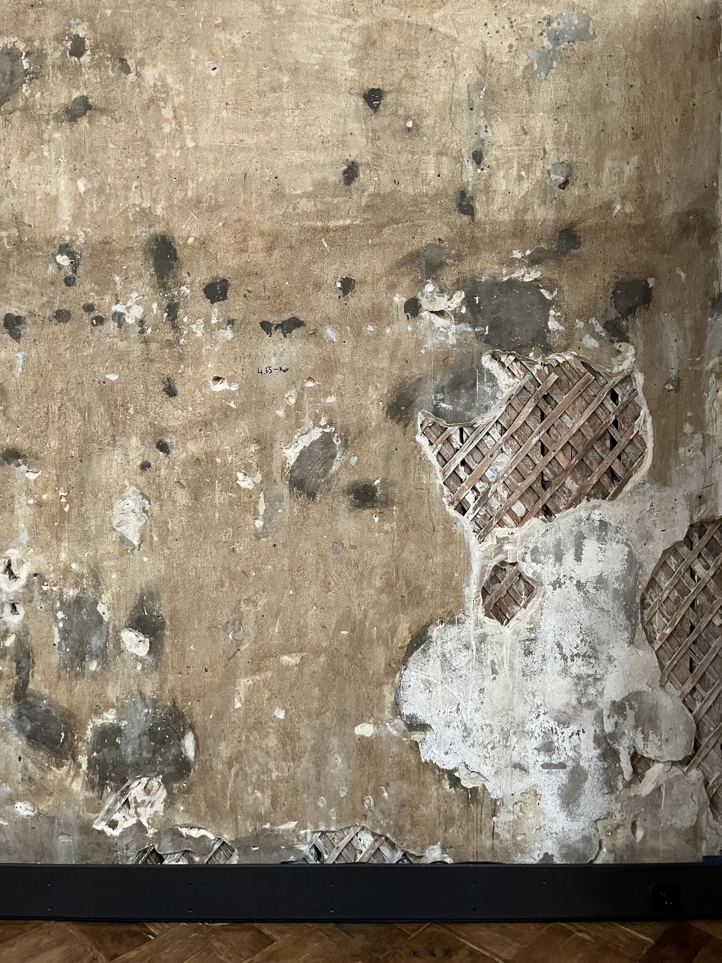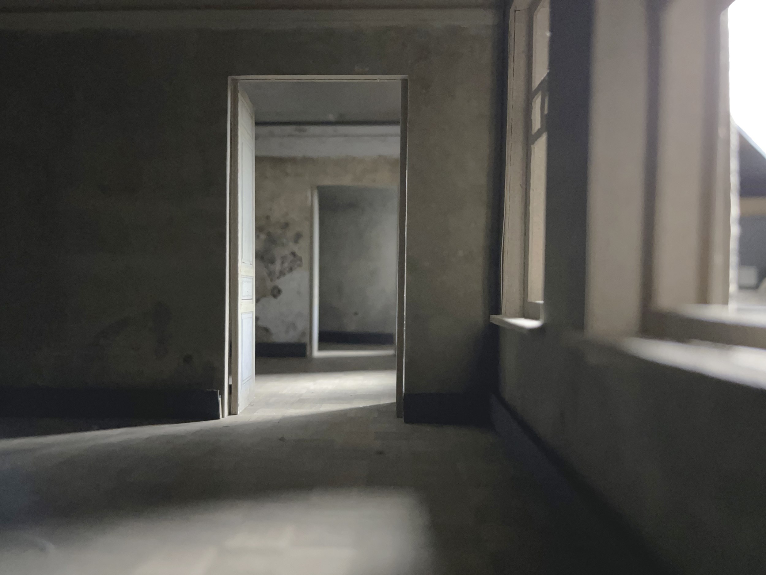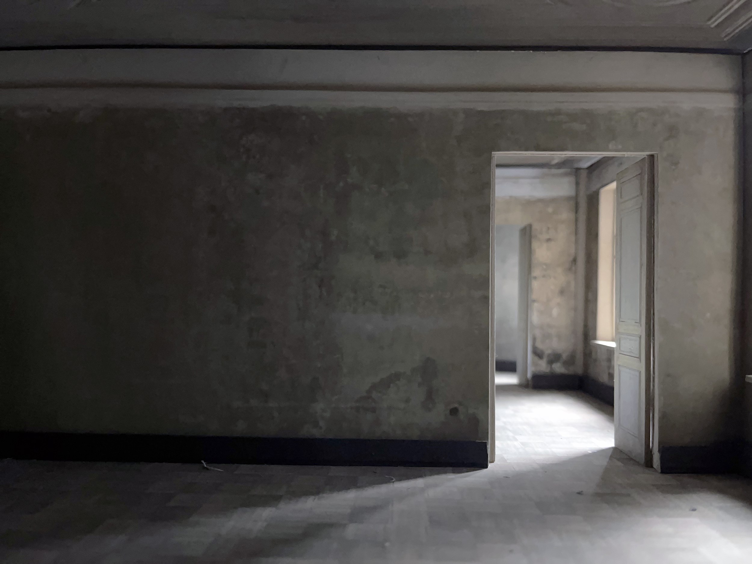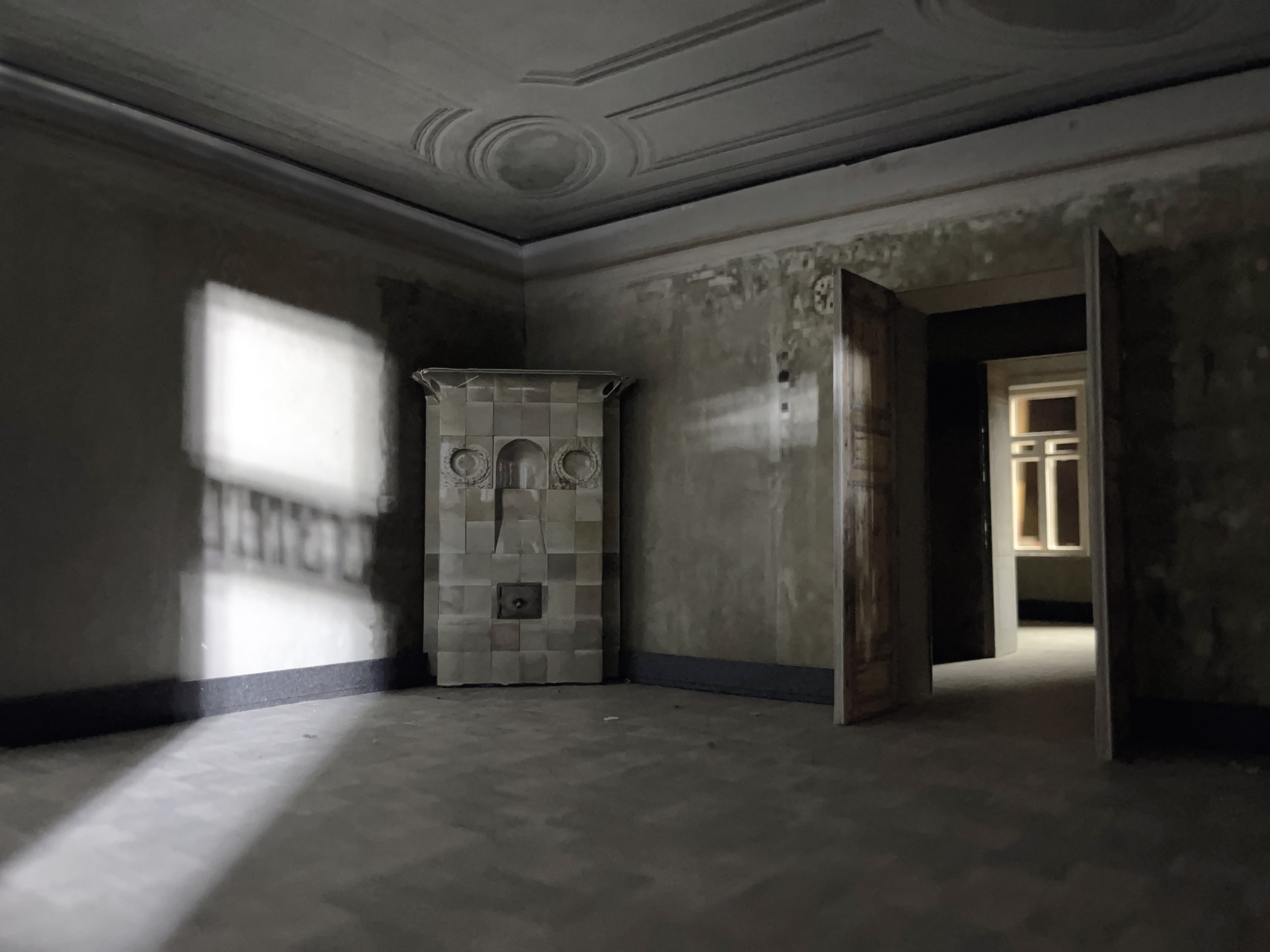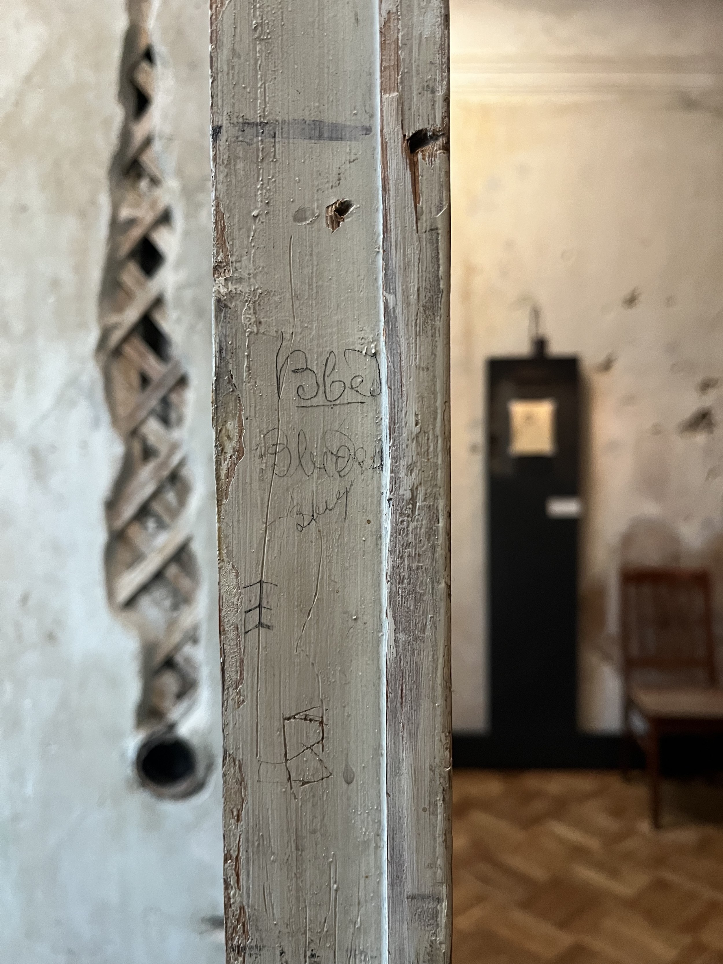 Стены с островами сохраненных фрагментов можно разглядывать бесконечно, всматриваясь в каждое пятно: почему тут написано Prague, что за дверца, какой предмет оставил этот контур? На торце двери – кажется невероятным – сохранилась отсечка, которой отмечают рост: когда семья переехала в квартиру, будущему поэту было всего 10 лет.