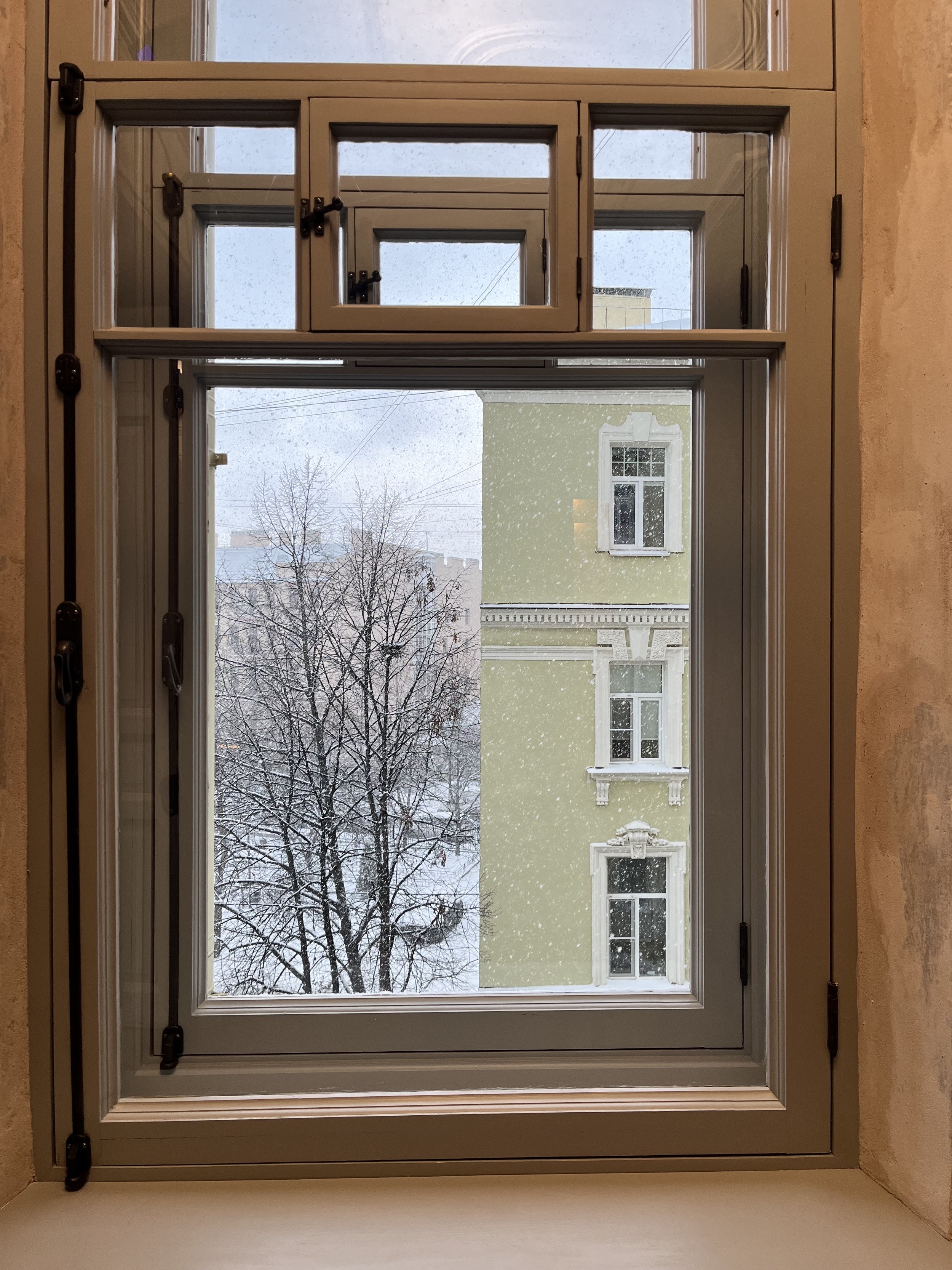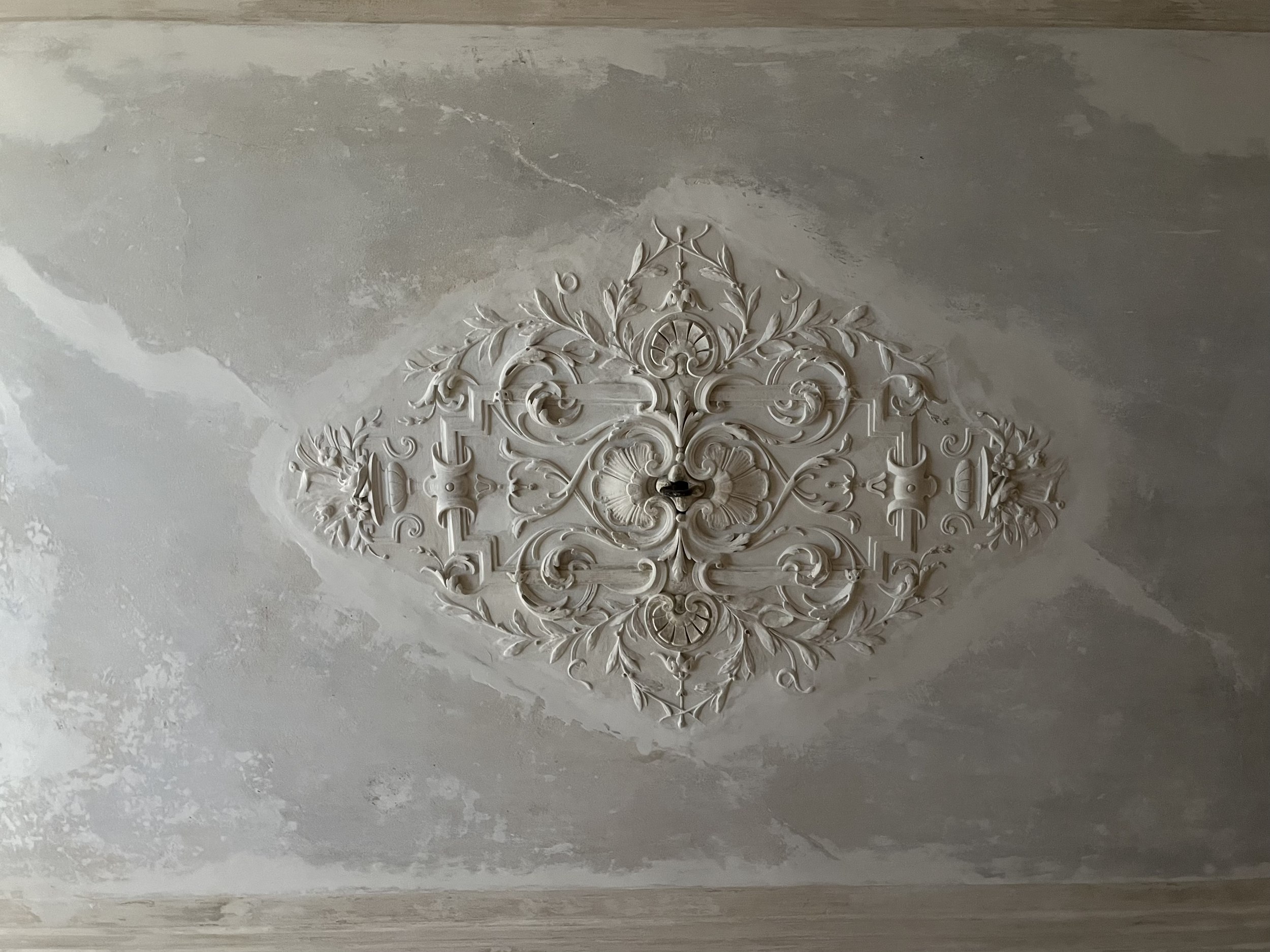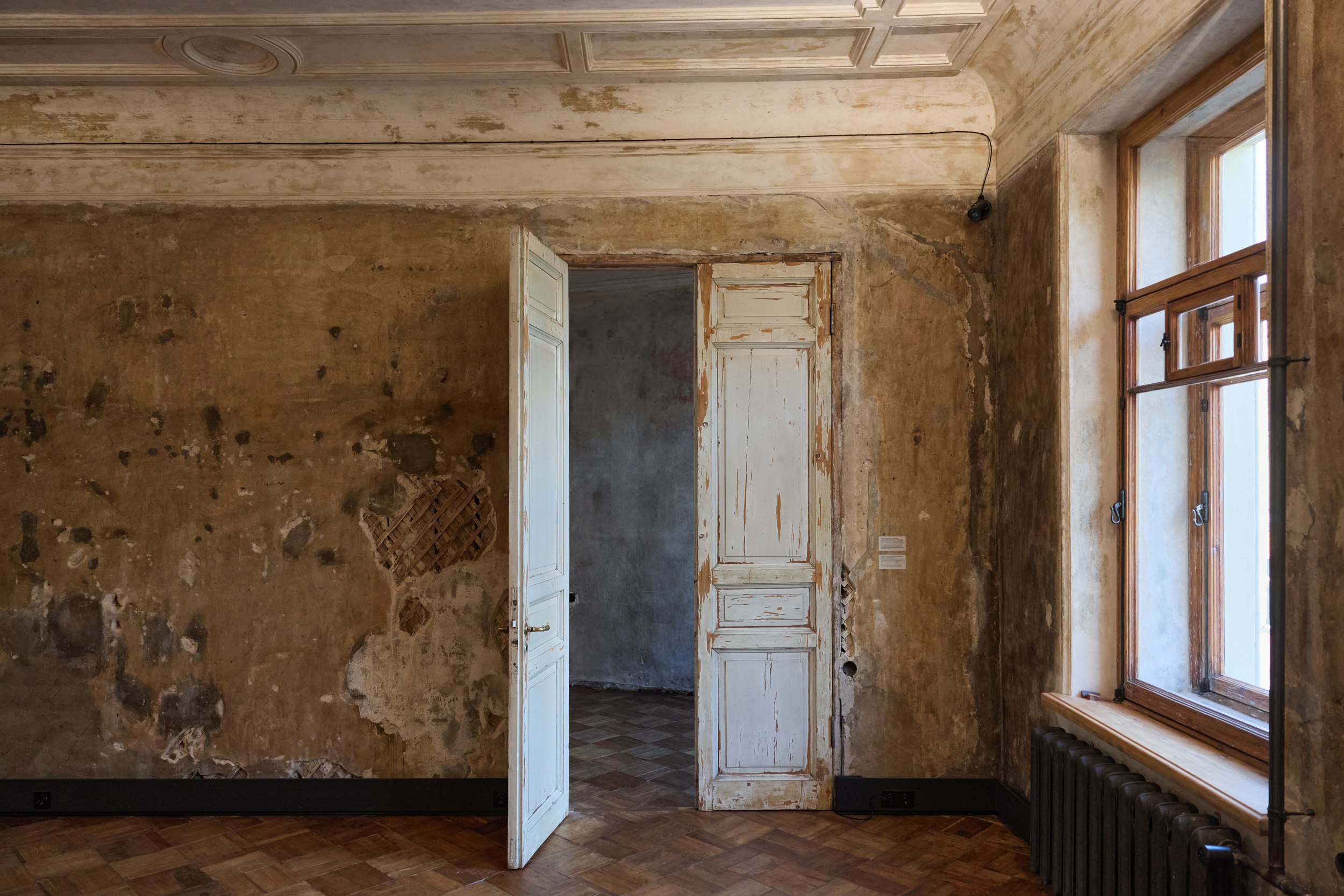 Очистив стены до штукатурки и выбрав фрагменты для сохранения, перешли к укреплению стен, потолков и перекрытий, реставрации утрат – лепнину, например, восстановить довольно просто, поскольку тут же рядом есть подлинный фрагмент. В трех комнатах пластиковые окна заменили на деревянные по образцу сохранившихся – их, кстати, все равно очень легко отличить о «родных». Все трещинки и потертости на месте – консерваторы прошлись по каждому сантиметру, инъекциями укрепляя штукатурный слой. На рыбий клей посадили дранку, полы перебрали так, что остался и скрип.