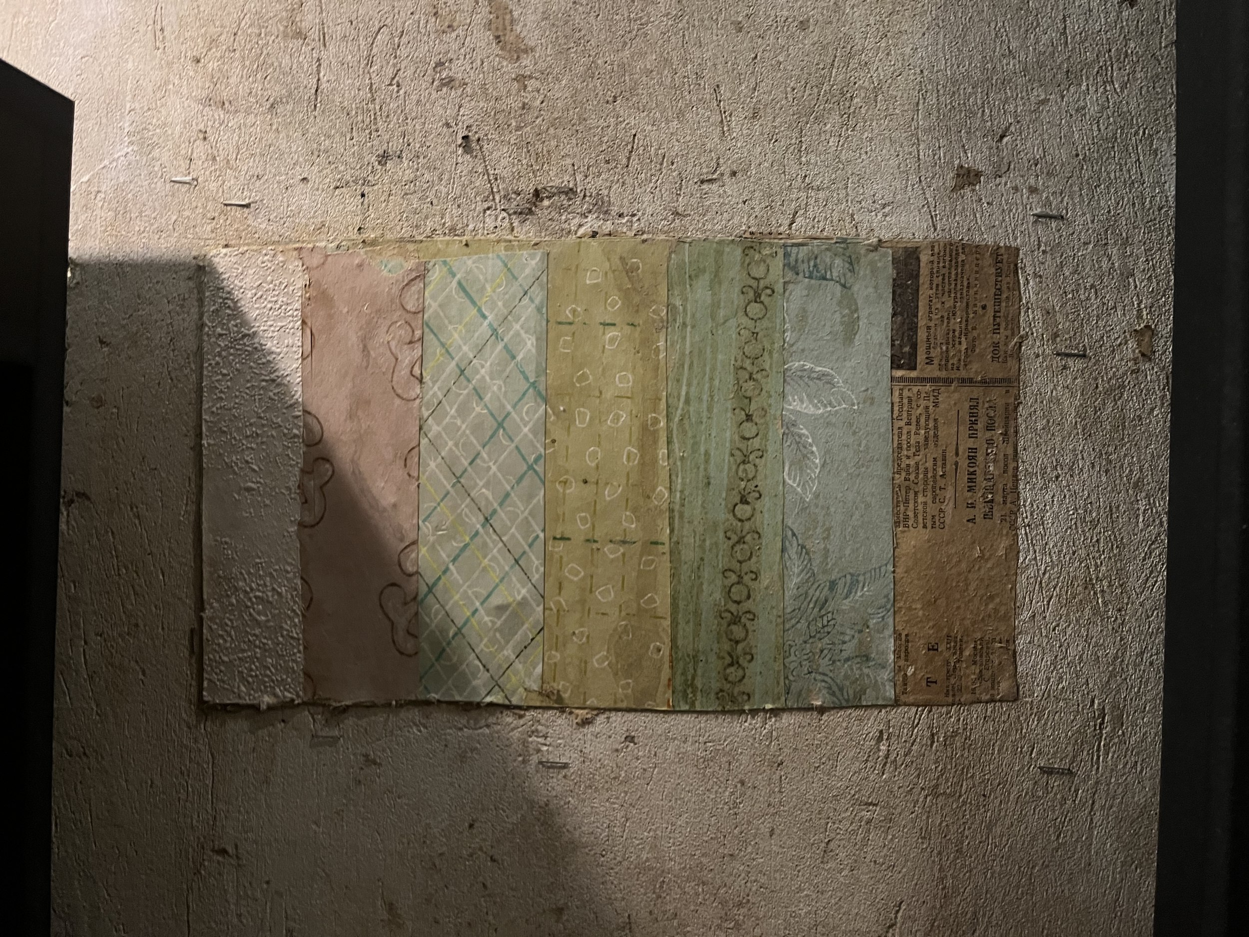 Консервация означает раскрытие подлинного и его сохранение. Прежде всего квартире оказали первую помощь, вылечив от плесени и грибка. Затем тщательно снимали и изучали многочисленные слои – истинная археология, которую наглядно демонстрирует фрагмент из 7 полосок различных покрытий: от пожелтевшего газетного листа до имитирующих штукатурку синтетических обоев.