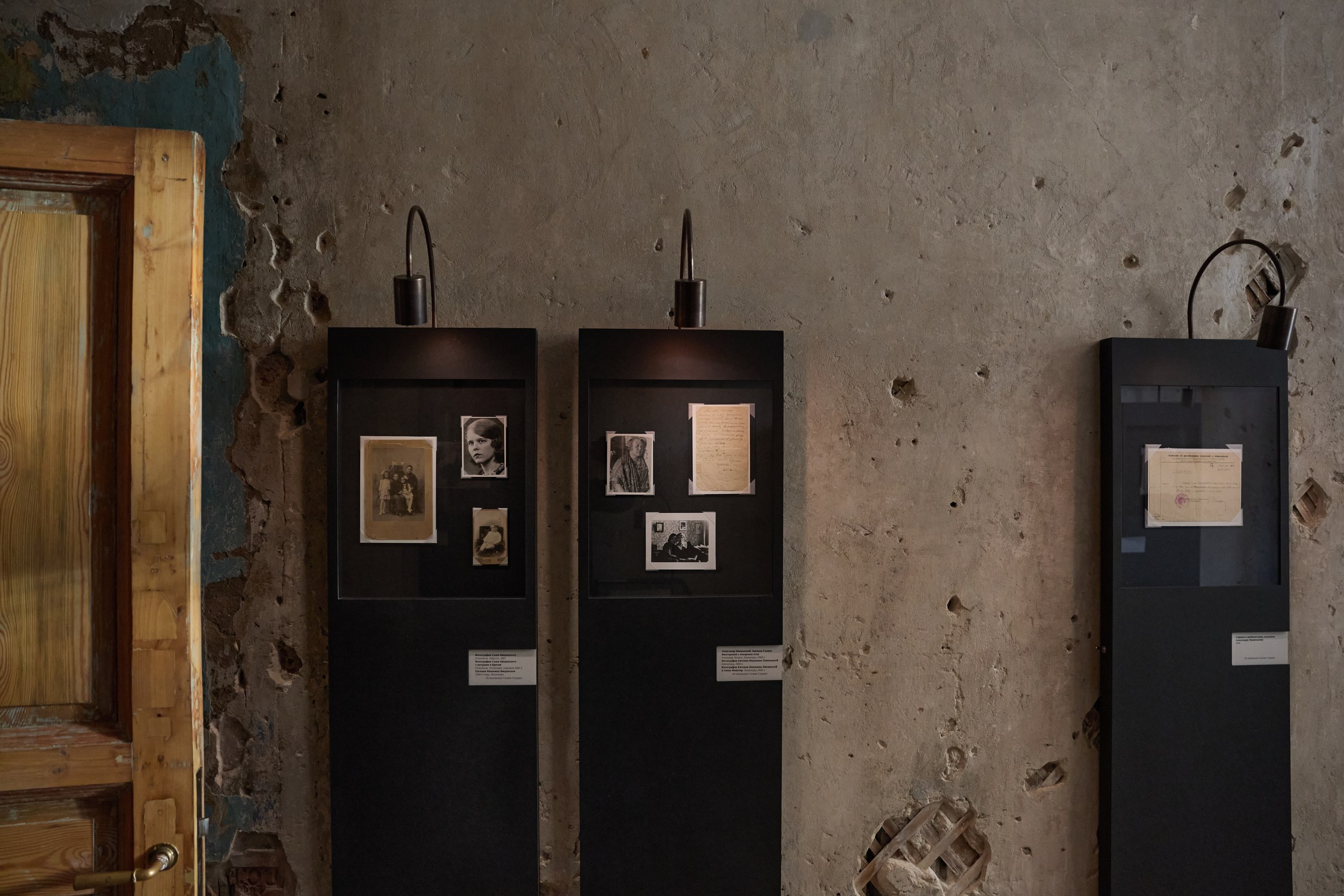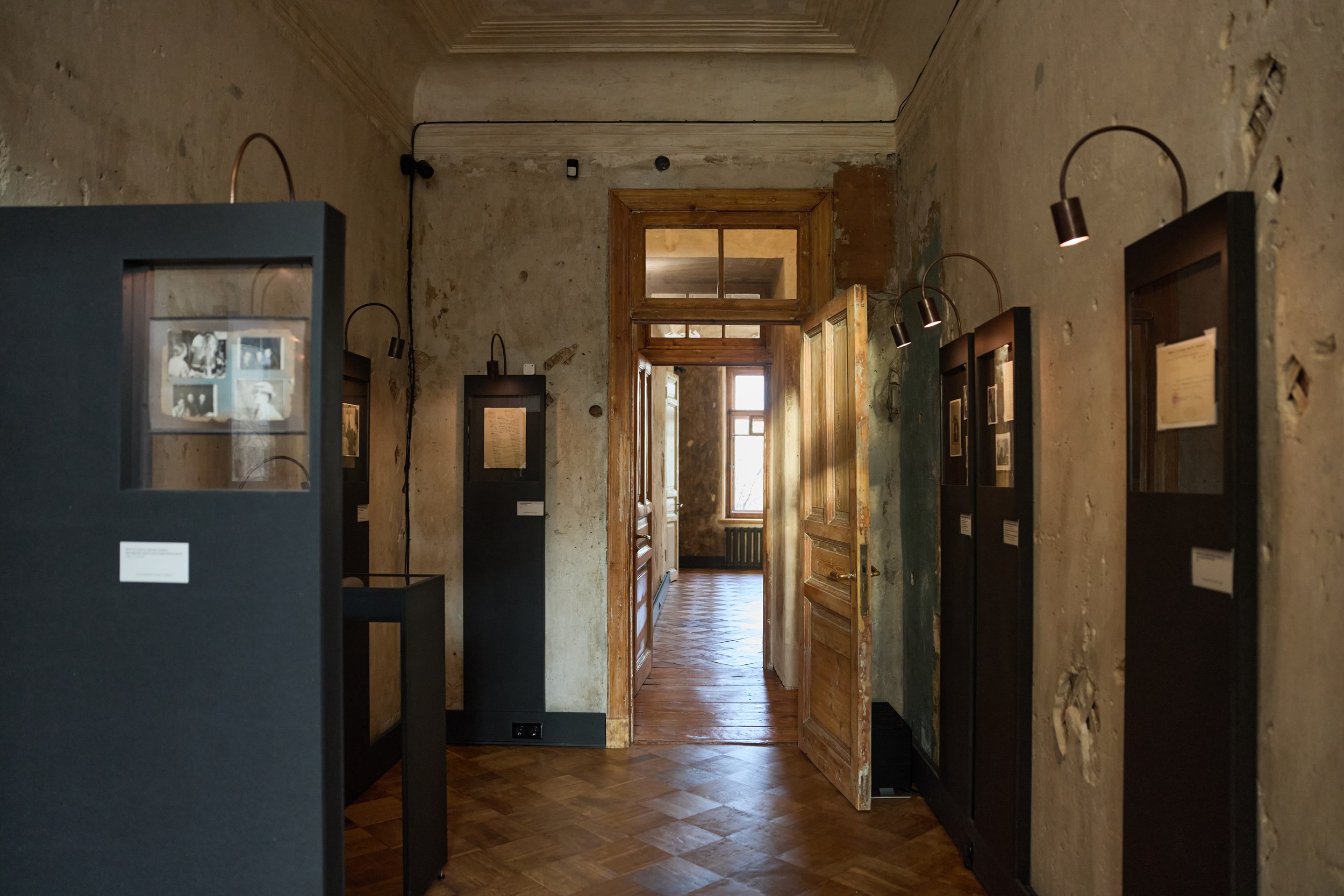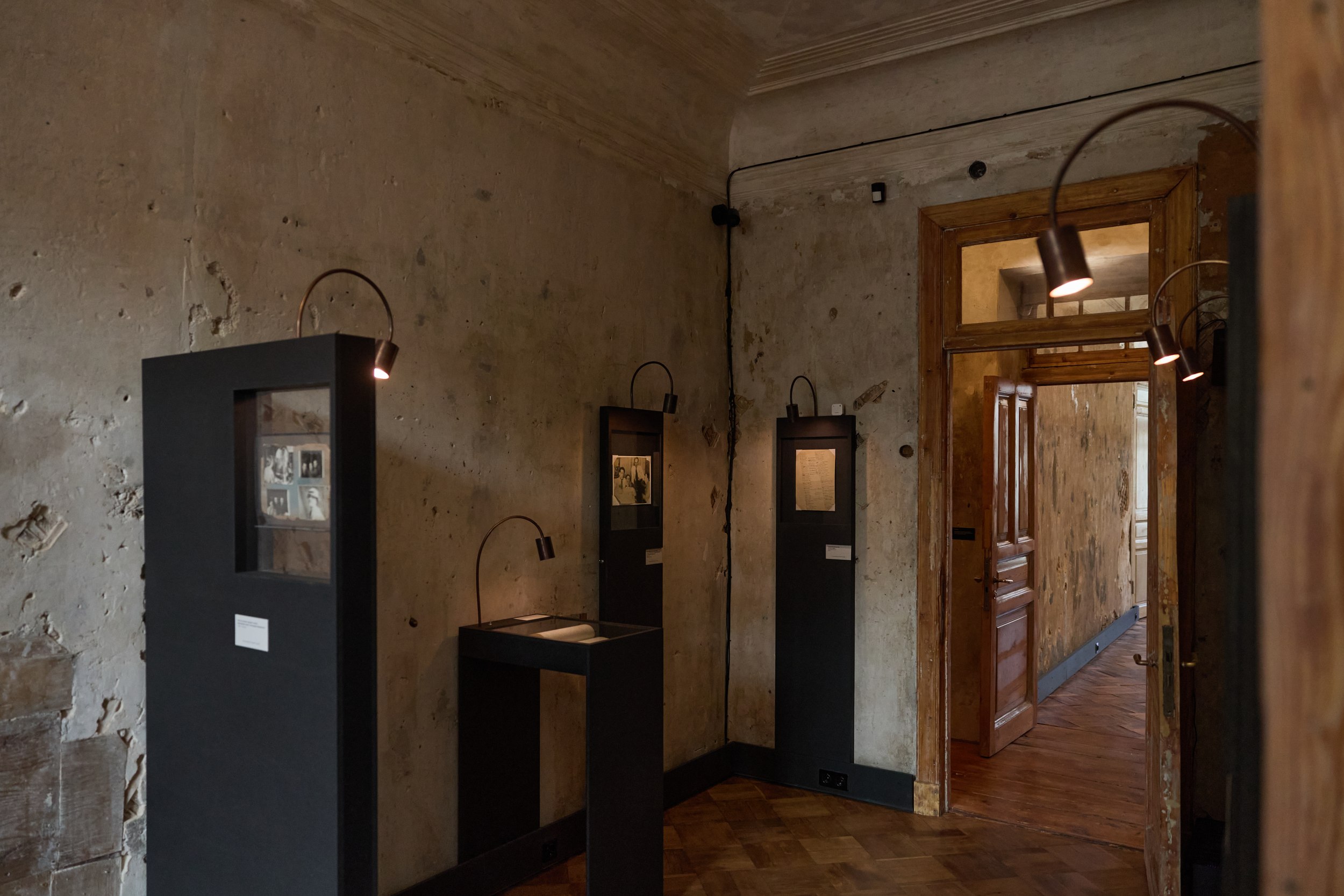 Плинтус, витрины и освещение выполнены в черном цвете – вполне подходящий для эпохи погубленных жизней цвет. Новые предметы ни в коей мере не притворяются подлинными, хотя материал – окрашенные в толще плиты МДФ – как будто слегка припылен, так и хочется провести по нему пальцем. Качество исполнения ремесленное – витрины и плинтус изготовил своими руками Владимир Петросян. Документы застывают в стекле, словно в вакууме времени, из которого их выхватывает свет лампочек-удильщиков. Лаконичные таблички возле входных дверей скупо напоминают, что происходило в помещениях при владельцах.