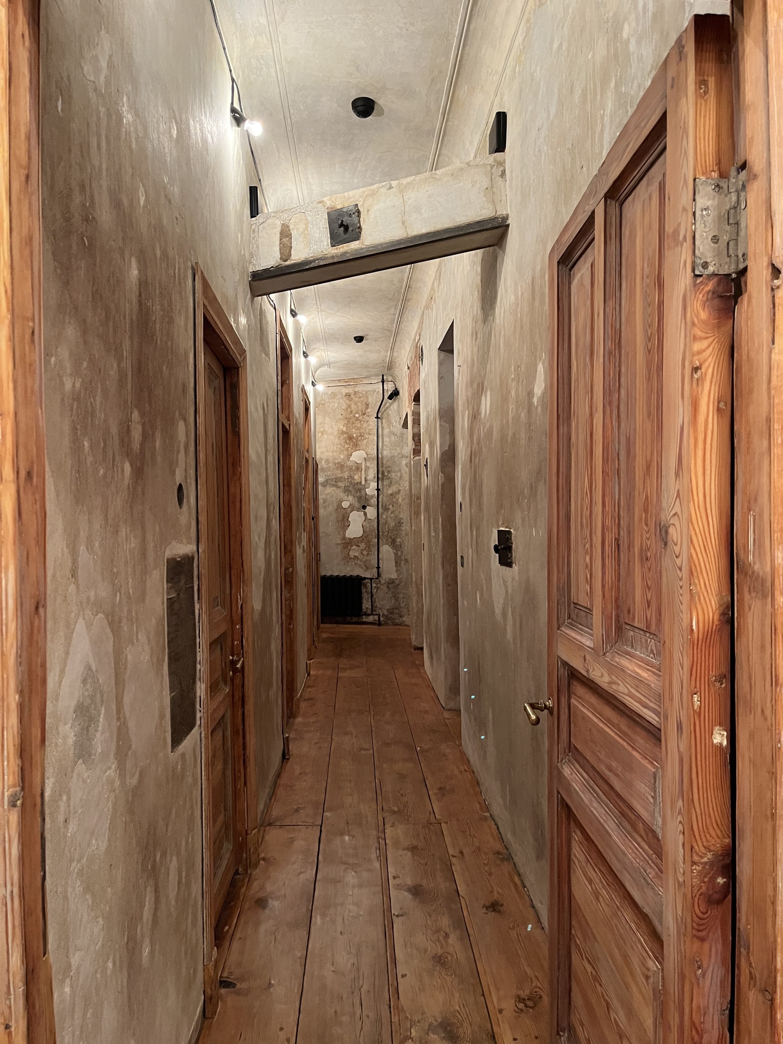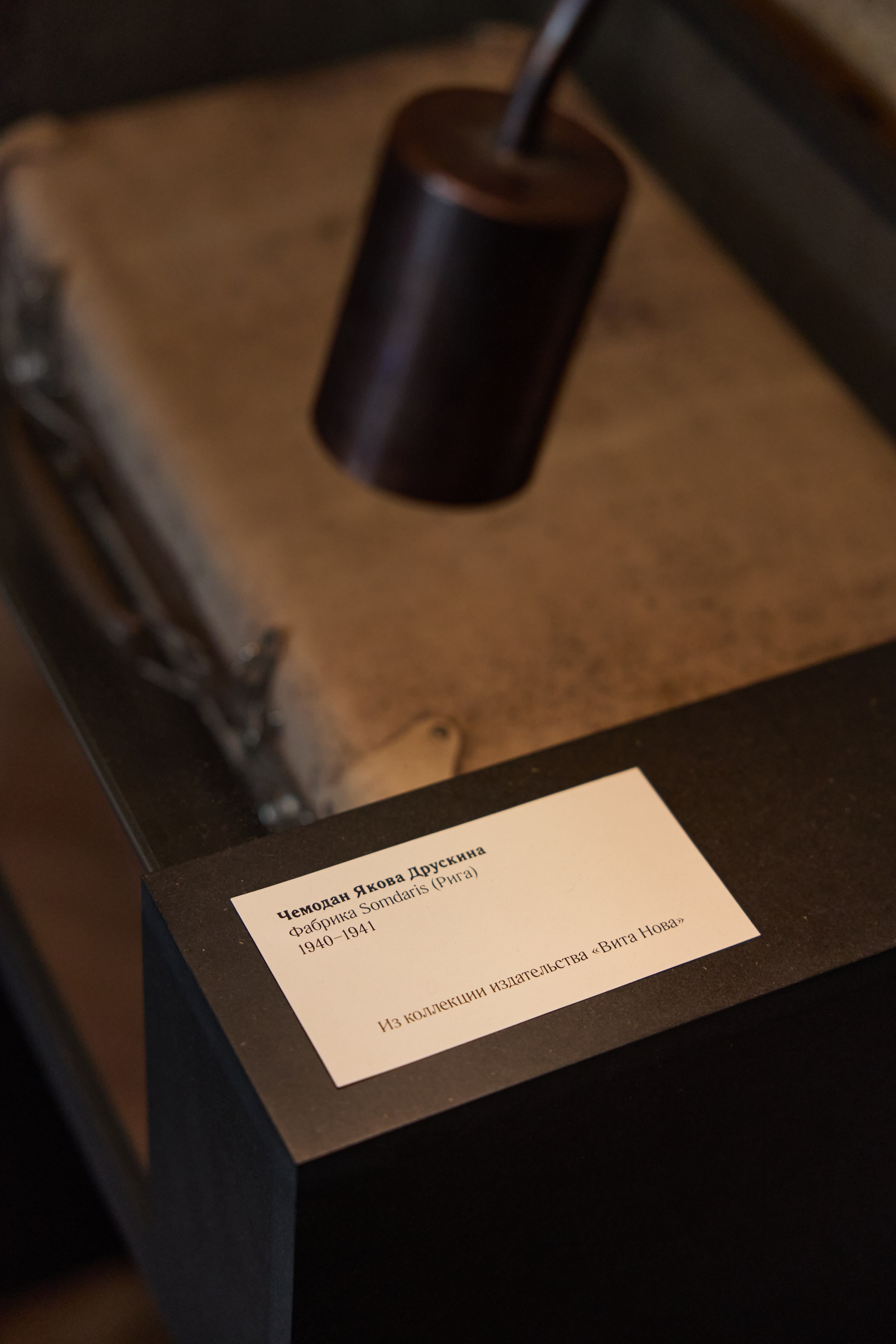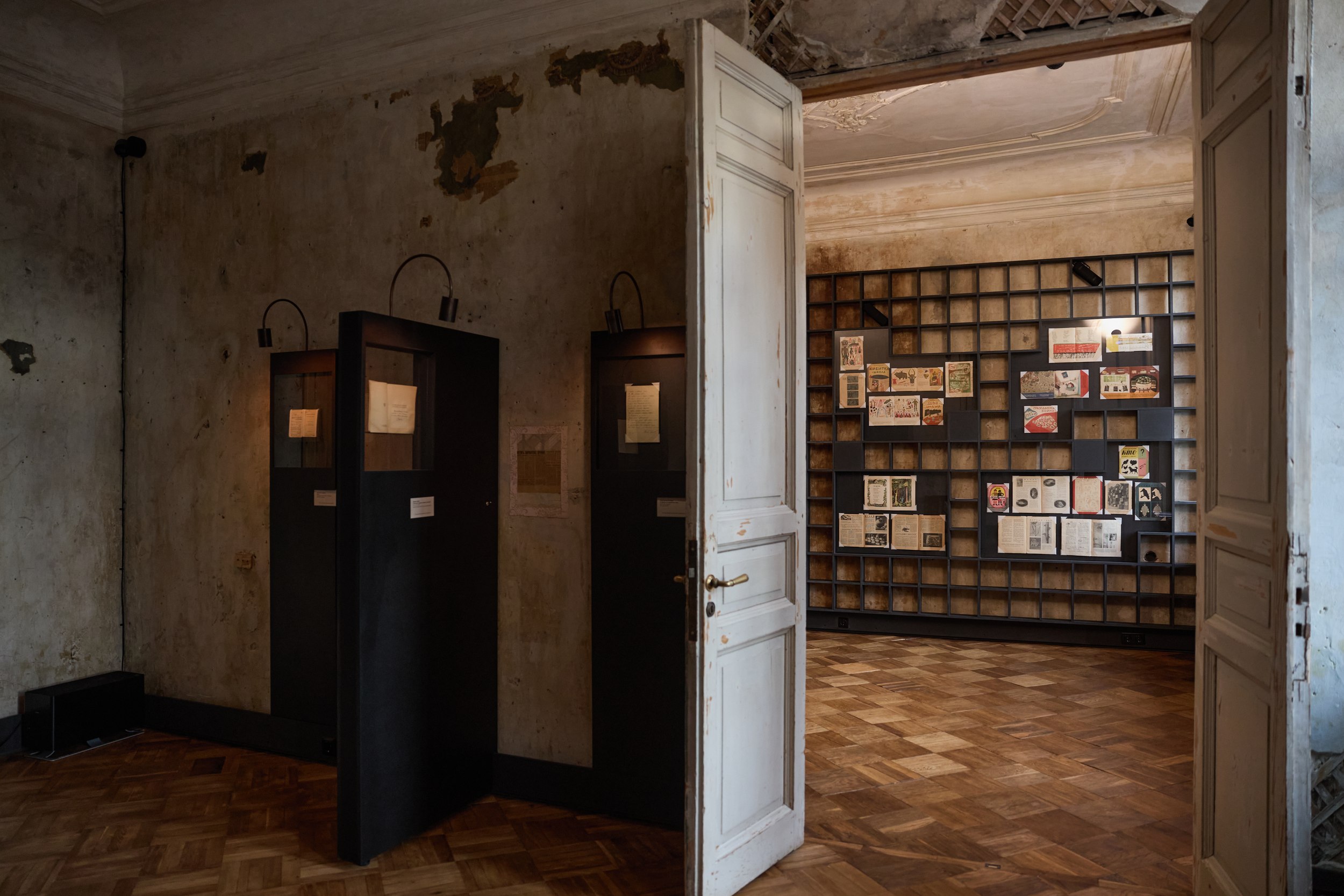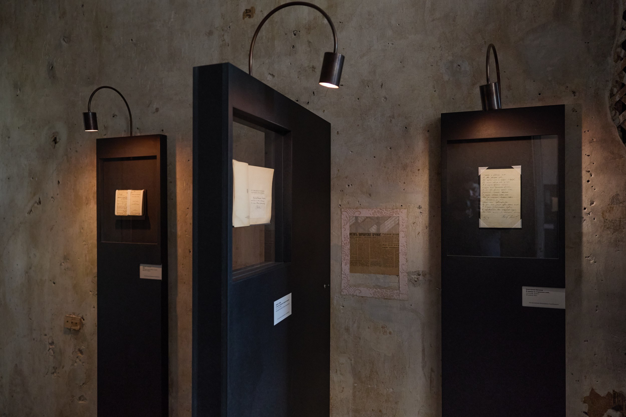 Плинтус, витрины и освещение выполнены в черном цвете – вполне подходящий для эпохи погубленных жизней цвет. Новые предметы ни в коей мере не притворяются подлинными, хотя материал – окрашенные в толще плиты МДФ – как будто слегка припылен, так и хочется провести по нему пальцем. Качество исполнения ремесленное – витрины и плинтус изготовил своими руками Владимир Петросян. Документы застывают в стекле, словно в вакууме времени, из которого их выхватывает свет лампочек-удильщиков. Лаконичные таблички возле входных дверей скупо напоминают, что происходило в помещениях при владельцах.