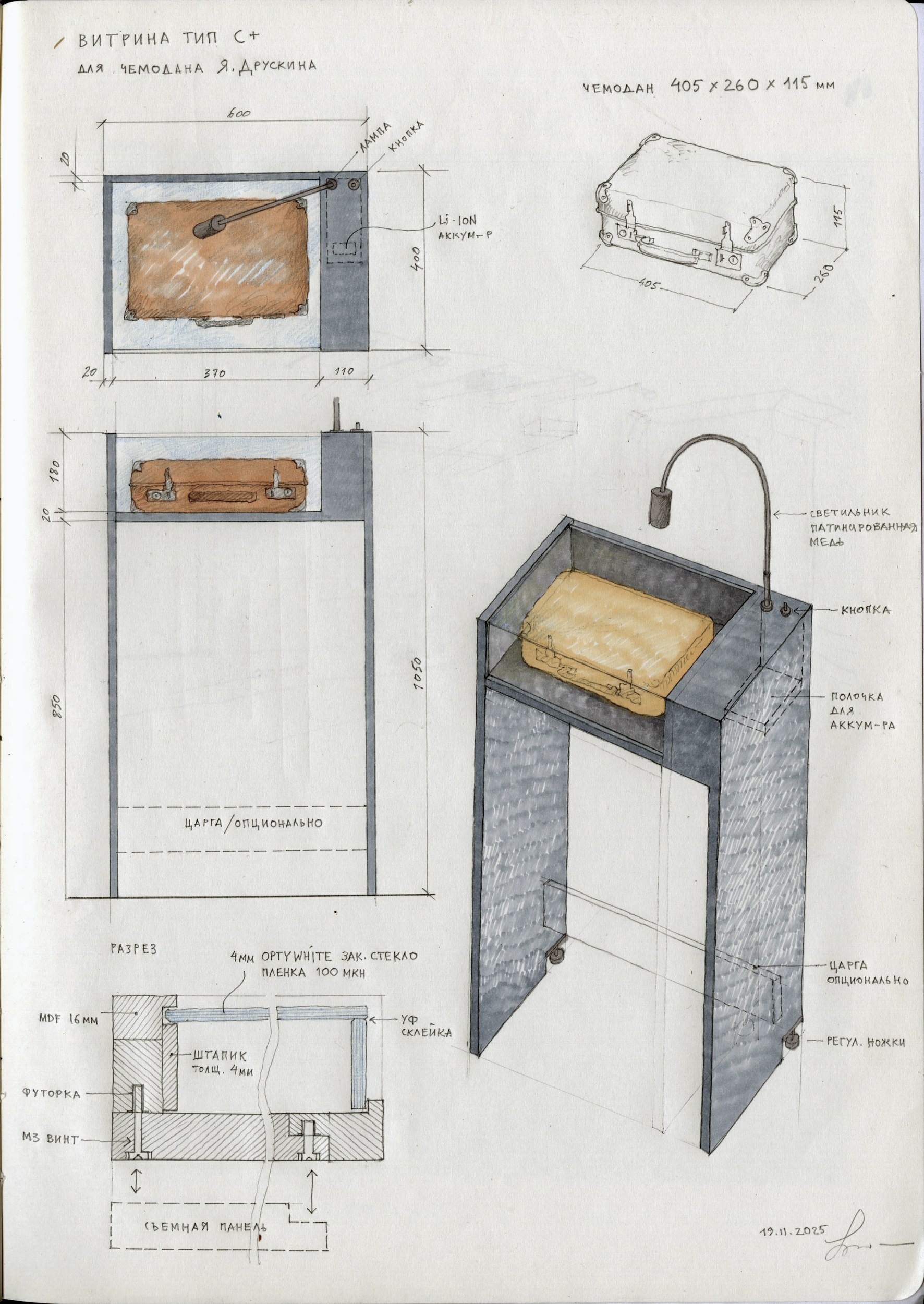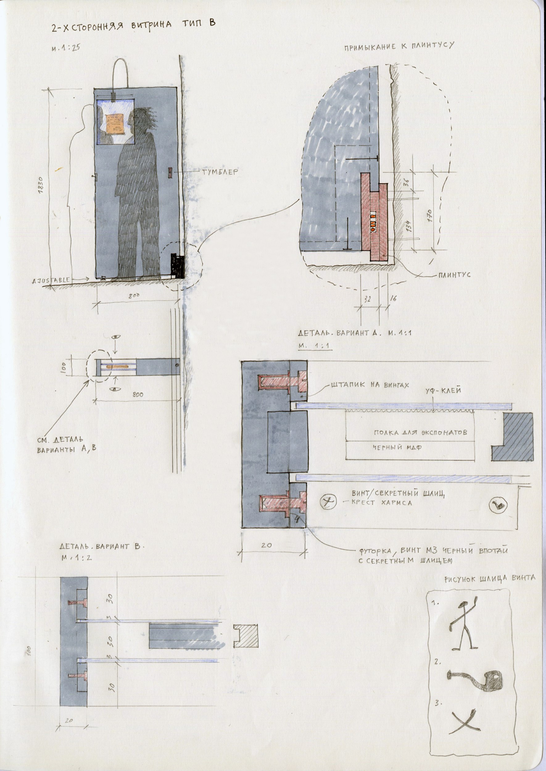 Для показа документов и немногочисленных предметов Сергей Мишин изобрел многофункциональный «умный плинтус». В него встраиваются провода, что сокращает визуальные шумы. К нему же крепятся витрины и осветительные приборы, не задевая материю стен: сам плинтус при этом висит на «шпильках». Также он играет роль строительного уровня – горизонталь помогает понять живую кривизну стен и углов.